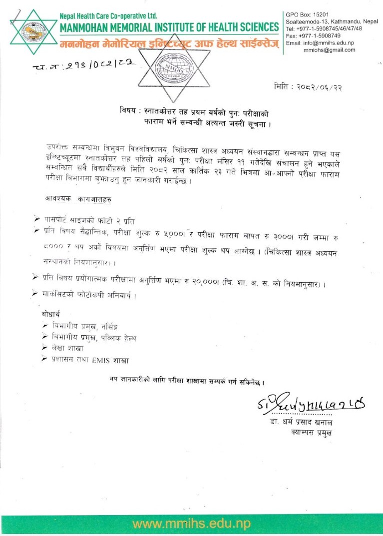 Read MoreDear students, parents and well-wishers, It gives me immense pleasure to Welcome you to Manmohan Memorial Institute of Health Sciences at Soalteemode, Kathmandu. On behalf of MMIHS, I would like to assure our parents, students and well-wishers for quality education at 21st century in health sciences through the renowned faculty members, outstanding learning environment, exemplary labor...